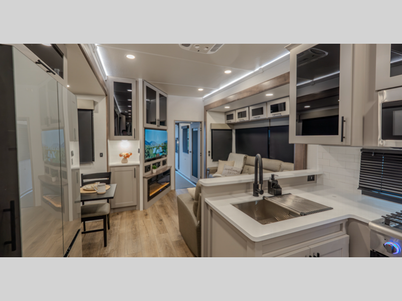 Alliance RV Valor toy hauler 41V13 highlights: Kitchen Island Fireplace Loft ... more about Valor 41V13