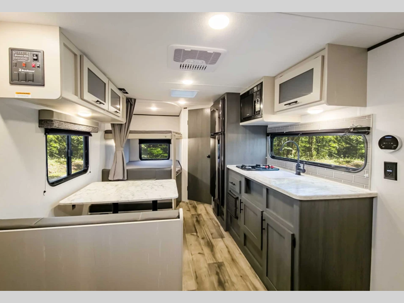Sleeps 4 Length 15 ft 11 in Ext Height 9 ft 9 in Hitch Weight 320 lbs Dry Weight 2560 lbs Cargo Capacity 1740 lbs Fresh Water Capacity 21 gals Grey Water Capacity 34 gals Black Water Capacity 34 gals Furnace BTU 20000 btu Number Of Bunks 2 Available Beds Queen Refrigerator Type 12V Refrigerator Size 3.3 cu ft Cooktop Burners 2 Number of Awnings 1 AC BTU 8000 btu Awning Info 8' Power Axle Count 1 Shower Type Standard Similar Floorplans