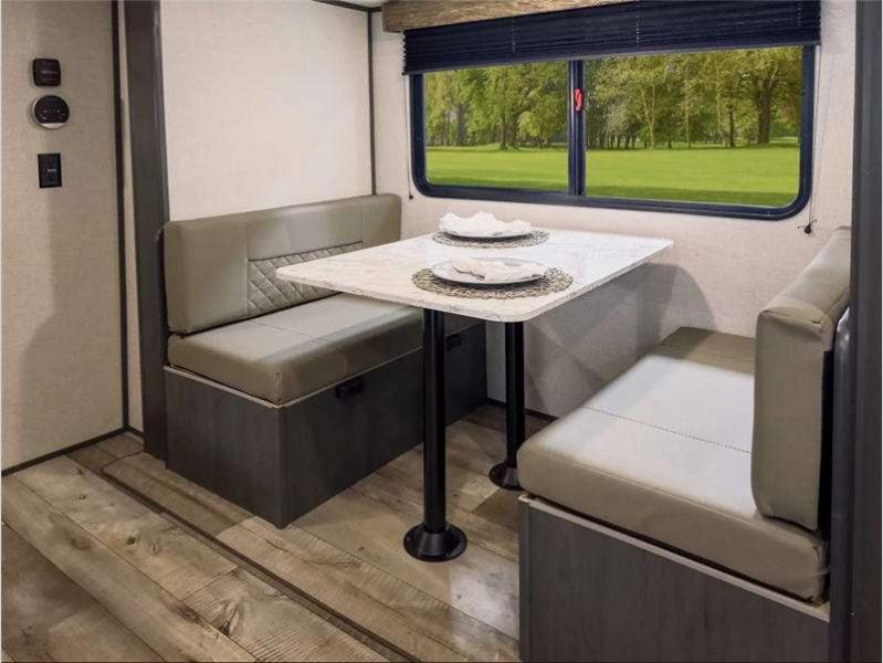 You will stay comfortable with the 8,000 BTU roof-mounted A/C and 20,000 BTU furnace, and there are stylish pleated night shades to make your space feel more like home. Each model is constructed on a wide body chassis and includes tinted safety glass windows and a 6' 4" interior height so you can easily move about.