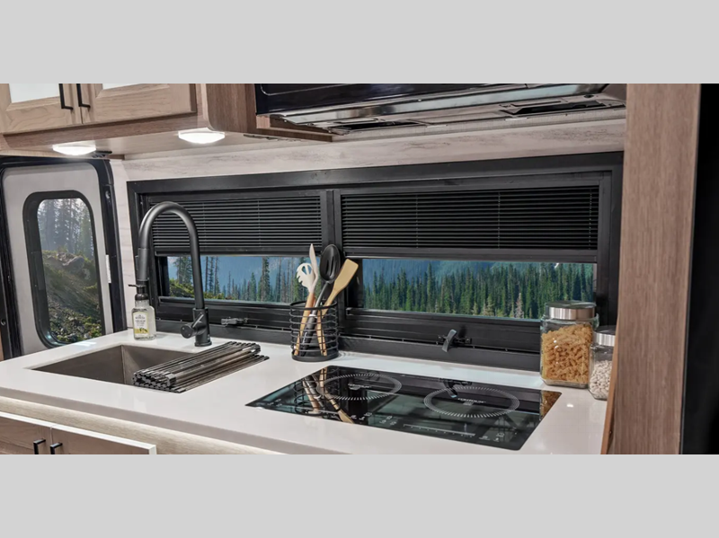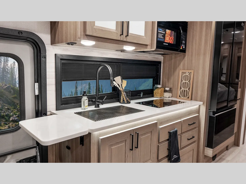 You'll love the bright interior, solid surface countertops and 7' ceiling height. There is a spacious shower and a tankless water heater for added comfort, and the 8K Cummins Onan generator plus 50 Amp service will keep you powered up. Outside, slam latch cargo doors will keep your gear secure, and the one-piece molded fiberglass front cap is ultra sleek.