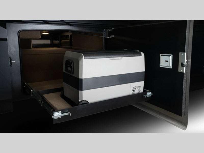 - E-Z Drive™ Premier; One-piece, seamless fiberglass front & rear caps; Automotive-bonded panoramic window in front cap w/ power shade; Lippert™ 4000 series dual-pane frameless bonded windows; (2) 15,000 BTU A/C units w/ heat pump on main A/C; Electric patio awning w/ LED lights; 2,000W pure sine wave inverter; Power cord reel w/ 50-amp service; Sony® infotainment center w/ Apple CarPlay® & Android Auto™; Backup & side-view cameras; Residential refrigerator; Residential-size convection microwave