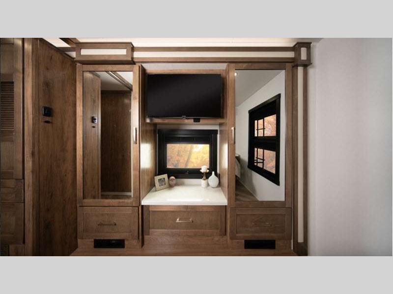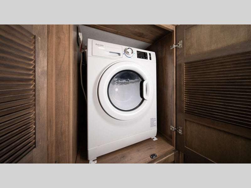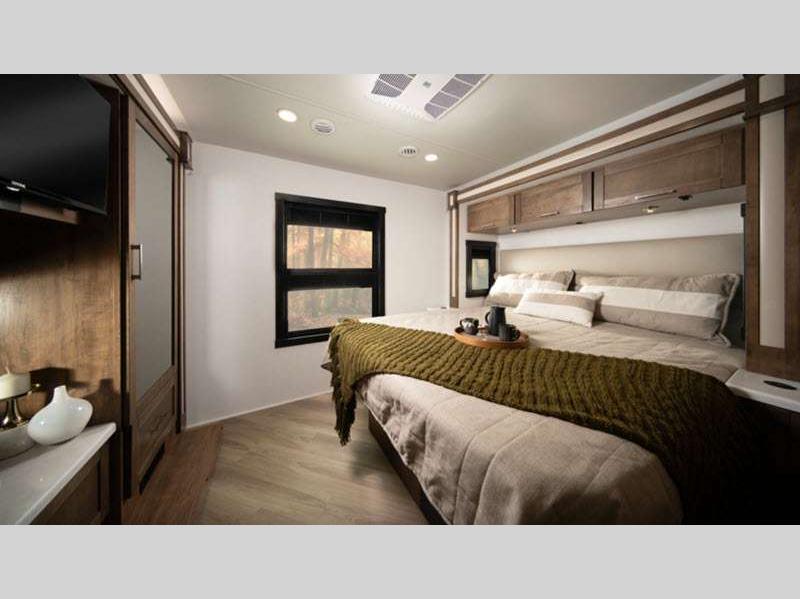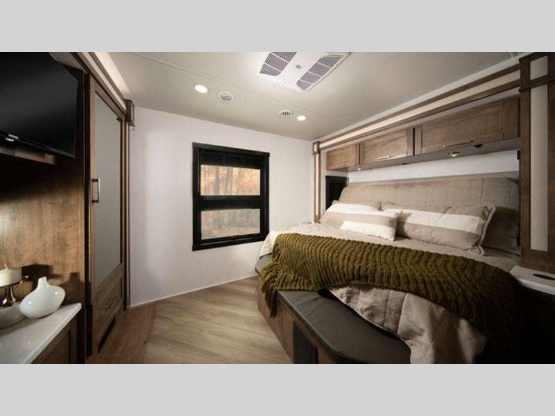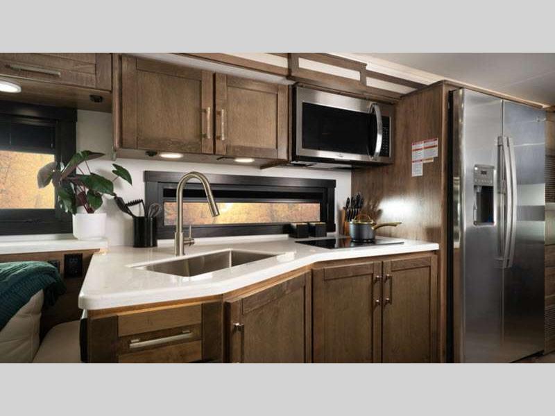 The interior is designed to make you feel at home with hardwood cabinet doors and drawer fronts, vinyl plank flooring, and high-intensity recessed LED ceiling lights. Residential features are found throughout the kitchen, including a residential refrigerator and a residential-size convection microwave. You'll be pleased to find a walk-around king-size bed with nightstands, and full bath amenities for added convenience. The interior will impress you, but don't forget to check out the exterior. An electric patio awning with LED lights comes standard, along with an exterior entertainment center, electric powered entrance steps, and so much more!