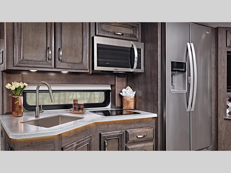 Each is built on a Ford F53 chassis with a 7.3L V-8 335 HP engine, and includes front and rear disc, 4-wheel anti-lock brakes, and a 5,000 lb. rear hitch receiver with dual connector and 7-pin plug to be able to tow your commuter vehicle or toys. The cockpit offers a Sony infotainment center with Apple CarPlay and Android Auto, backup and side-view cameras for safety when on the road and parking, and 6-way power and swivel driver/passenger seats to be able to enjoy the seating while driving or stopped. The interior offers luxurious amenities such as an electric fireplace, LED-lit solid surface kitchen countertops, a residential refrigerator, and a shower with decorative surround, glass door, skylight and light.