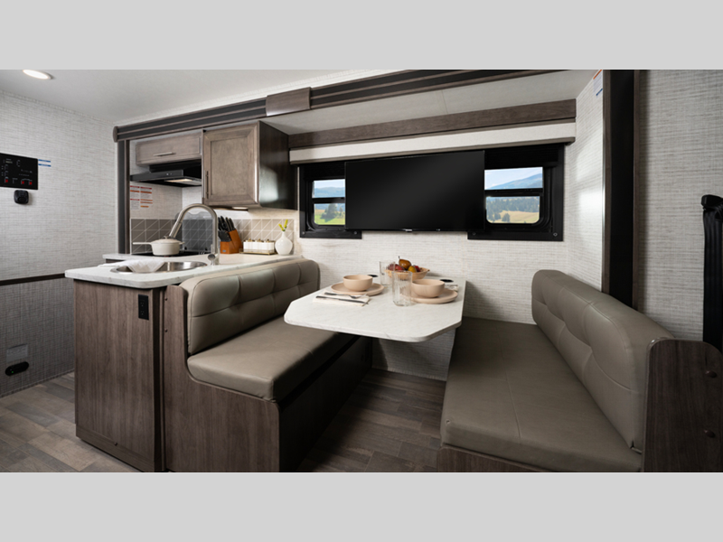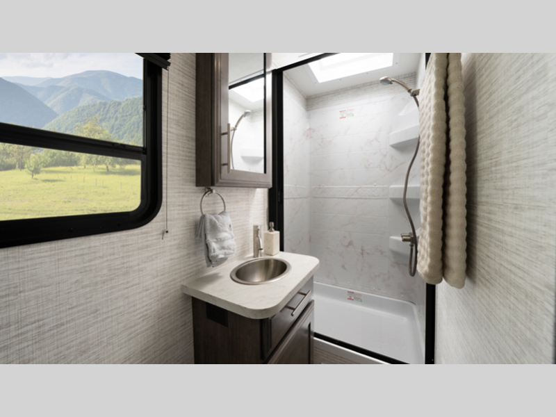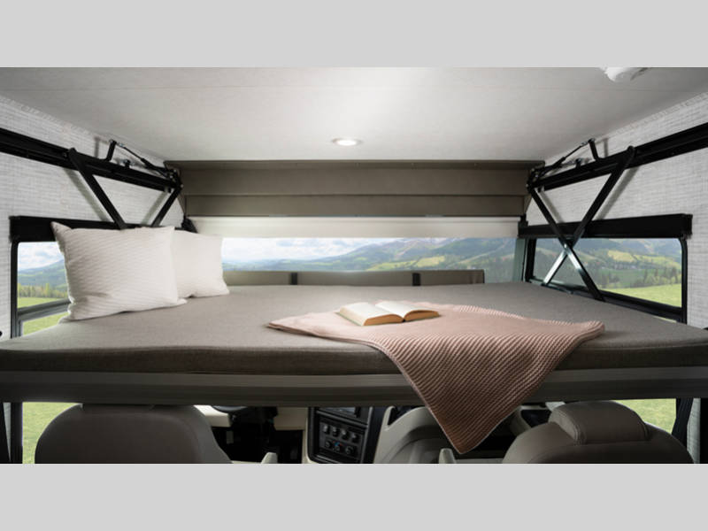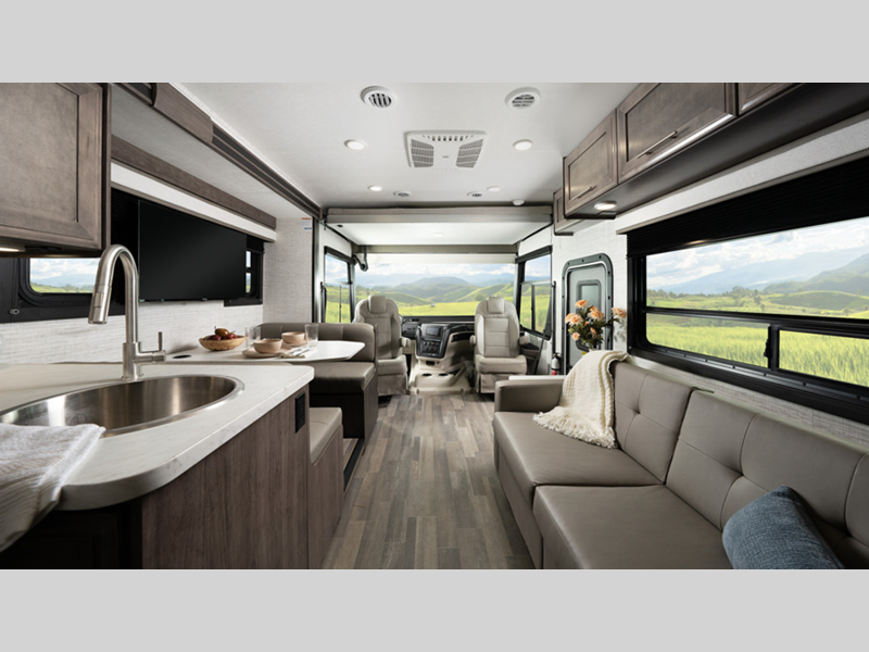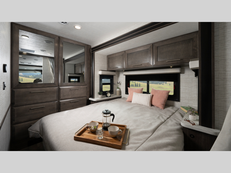 The 120-inch windshield, the largest in the industry, will let you enjoy great outdoor views as you travel, and the driver is sure to appreciate the Sony infotainment center plus backup and side-view cameras. The interior features hardwood cabinet doors and drawer fronts, decorative kitchen backsplash, and pleated blackout shades to name a few comforts.