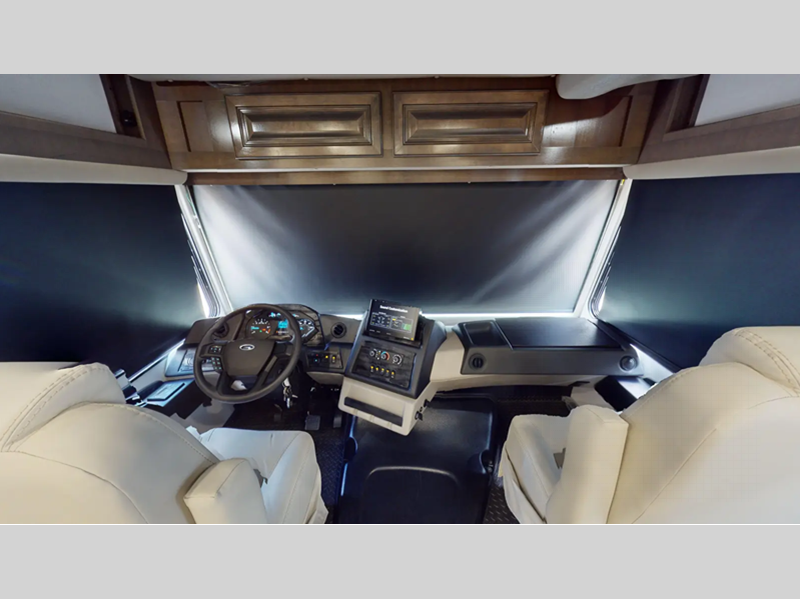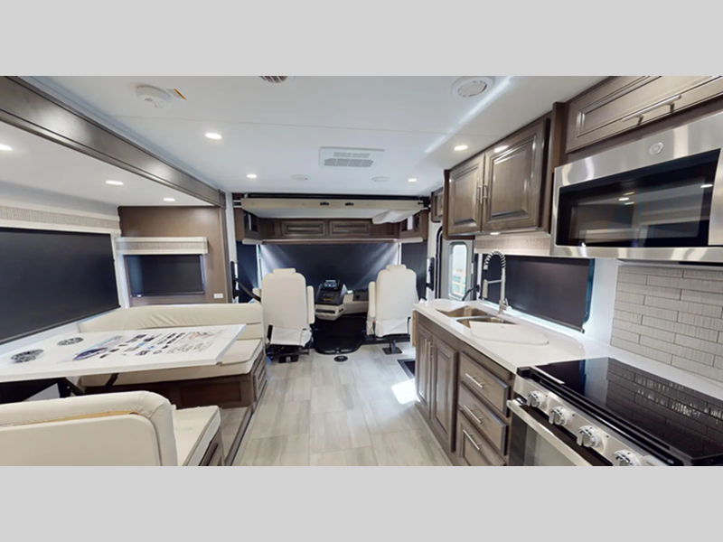 Sleeps 4 Slides 2 Length 34 ft 11 in Ext Width 8 ft 4 in Ext Height 12 ft 9 in Int Height 6 ft 10 in Exterior Color Carolina, Indigo, Poppy, Titanium Hitch Weight 5000 lbs GVWR 22000 lbs Fresh Water Capacity 80 gals Grey Water Capacity 42 gals Black Water Capacity 42 gals Furnace BTU 35000 btu Generator 6,000W Yamaha Fuel Type Gas Engine 7.3L V8 Chassis Ford F53 Horsepower 350 hp Fuel Capacity 80 gals Wheelbase 228 in Number Of Bunks 1 Available Beds King Torque 468 ft-lb Refrigerator Type Stainless Steel 3 Door Residential Refrigerator Size 18 cu ft Cooktop Burners 3 Number of Awnings 1 Axle Weight Front 8000 lbs Axle Weight Rear 15000 lbs LP Tank Capacity 24.5 Gal Water Heater Capacity 6 gal AC BTU 28500 btu TV Info LR 40" LED TV, BR 32" LED TV, Exterior 40" LED TV Awning Info 19' Encased Power with LED Lights Washer/Dryer Available Yes Gross Combined Weight 26000 lbs Shower Type Shower w/Seat Electrical Service 50 amp Similar Floorplans