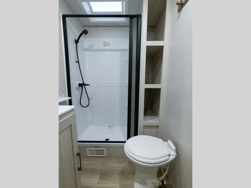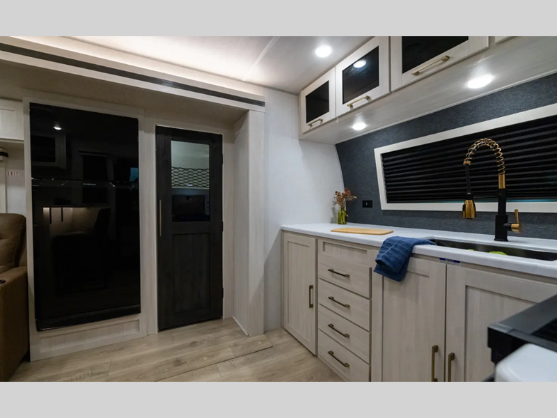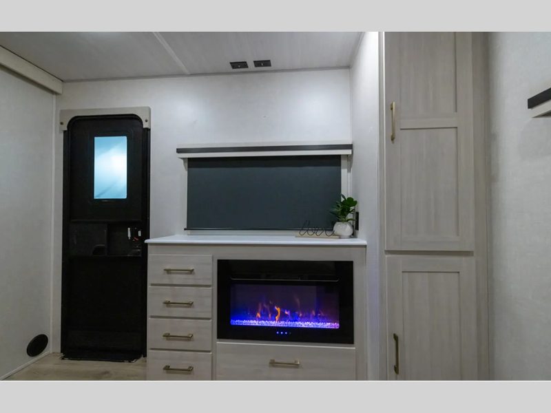 Each model is extended season ready with 12V tank heaters, a sealed underbelly with forced heat and radiant foil insulation, plus Azdel composite walls! The Goodyear tires and tire pressure monitoring system will provide hassle-free towing, and the electric stabilizer jacks make set up a breeze. You'll also appreciate a tankless water heater on board, along with an upgraded slow-close shower door, a central vacuum system, and many more conveniences. It won't be hard to feel right at home with a 5,200 BTU fireplace, custom king bed, Congoleum Carefree linoleum, and residential features!