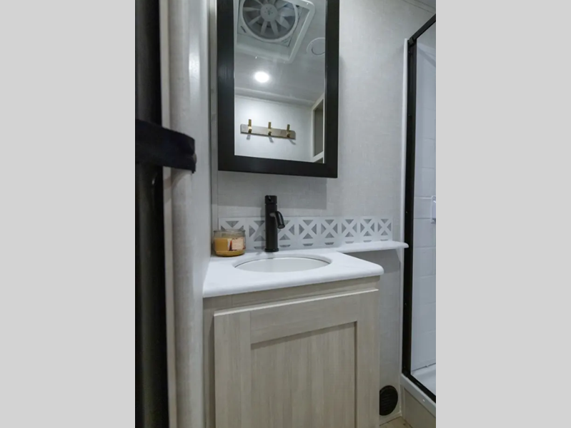 Sleeps 3 Slides 1 Length 30 ft 7 in Ext Width 8 ft Ext Height 11 ft 3 in Hitch Weight 615 lbs Dry Weight 6063 lbs Cargo Capacity 1552 lbs Fresh Water Capacity 40 gals Grey Water Capacity 60 gals Black Water Capacity 30 gals Available Beds Custom King Refrigerator Type Black Glass Refrigerator Size 10 cu ft Number of Awnings 1 Water Heater Type Tankless AC BTU 15000 btu TV Info LR HD TV Awning Info 19' Electric with LED Lights Axle Count 2 Shower Type Standard Electrical Service 50 amp Similar Floorplans