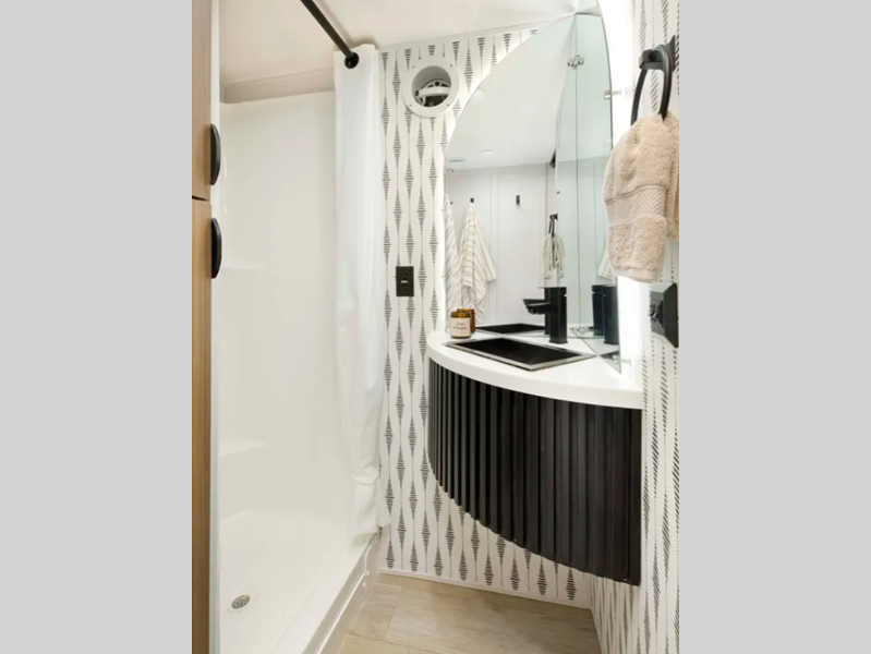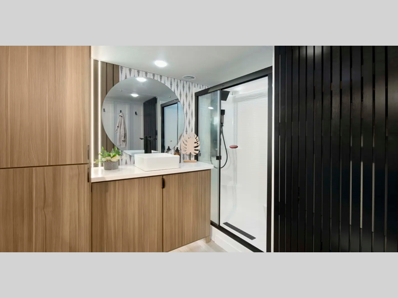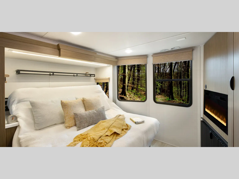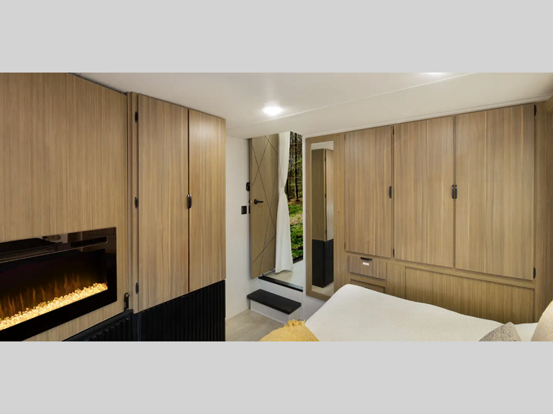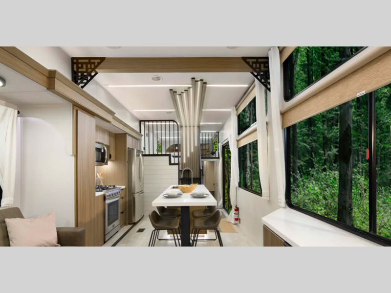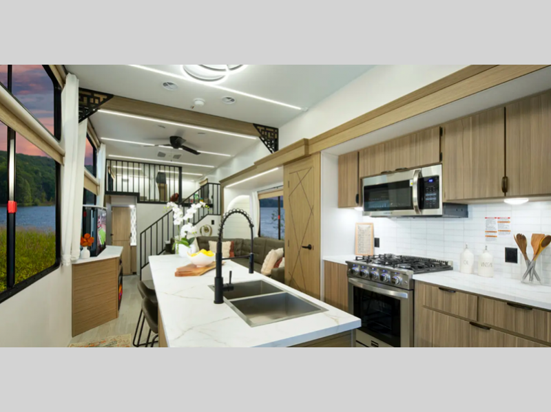 There is a heated and enclosed Accessibelly that will provide protection against the elements and road debris during transport. Residential features, such as stainless-steel kitchen appliances and stylish roller shades will let you enjoy extended stays in comfort. A tankless water heater will provide endless hot showers, and you'll stay entertained with the JBL stereo!