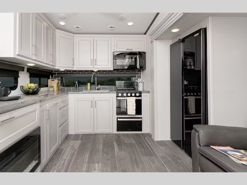 Sleeps 5 Slides 3 Length 33 ft 8 in Ext Height 13 ft 4 in Exterior Color Black Onyx Midnight, Phantom Gray Midnight, Hero Edition Options Hitch Weight 2060 lbs Dry Weight 10567 lbs Cargo Capacity 2333 lbs Fresh Water Capacity 75 gals Grey Water Capacity 76 gals Black Water Capacity 38 gals Tire Size ST235/80R16E Furnace BTU 30000 btu Available Beds Queen Refrigerator Type 12V Refrigerator Size 16 cu ft Cooktop Burners 3 Number of Awnings 2 LP Tank Capacity 30 lbs Water Heater Type Tankless On Demand AC BTU 15000 btu TV Info LR LED HDTV Awning Info 10' & 15' Electric with Gas Strut Arm with Dotless Neon Style LED Lighting Axle Count 2 Washer/Dryer Available Yes Number of LP Tanks 2 Shower Type Standard Electrical Service 50 amp Similar Floorplans