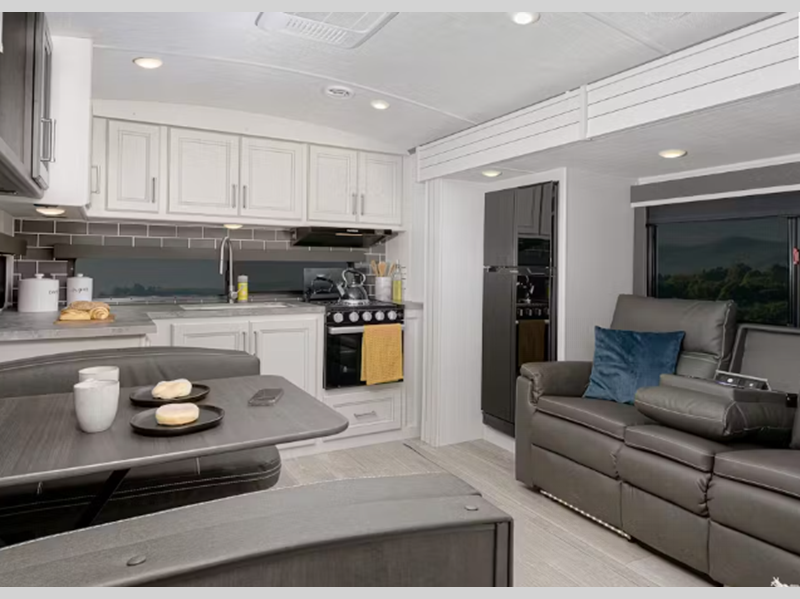 Sleeps 4 Slides 2 Length 33 ft 7 in Ext Height 11 ft 5 in Interior Color Driftwood Hitch Weight 990 lbs Dry Weight 7875 lbs Cargo Capacity 1915 lbs Fresh Water Capacity 54 gals Grey Water Capacity 76 gals Black Water Capacity 38 gals Tire Size ST225/75R15E Furnace BTU 30000 btu Available Beds King Refrigerator Type 12V Refrigerator Size 10.4 cu ft Cooktop Burners 3 Shower Size 36" x 30" Number of Awnings 2 LP Tank Capacity 20 lbs Water Heater Type Girard Tankless On Demand AC BTU 15000 btu TV Info LR LED HDTV Awning Info 10' Electric with Gas Strut Arm Axle Count 2 Number of LP Tanks 2 Shower Type Standard Electrical Service 50 amp Similar Floorplans