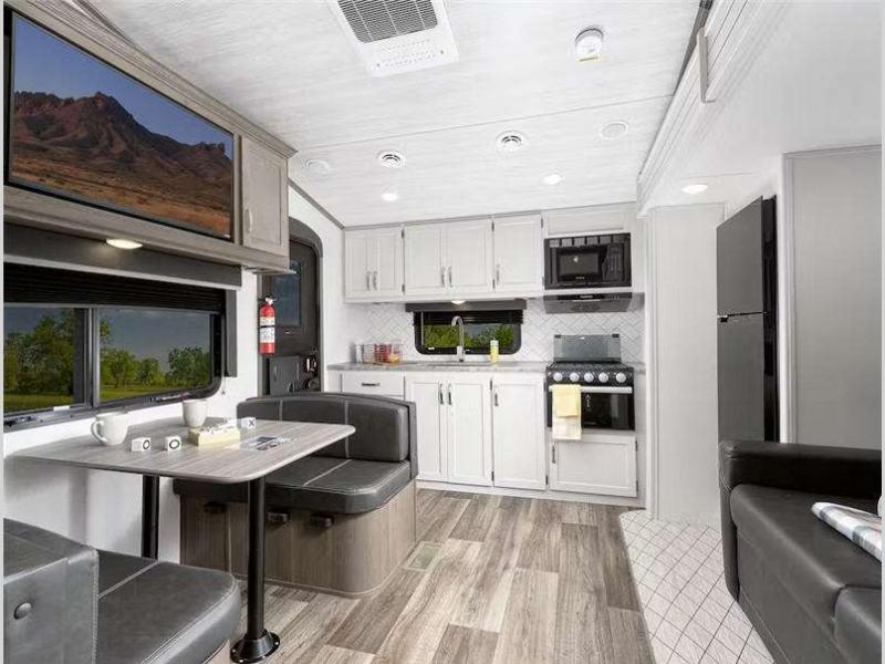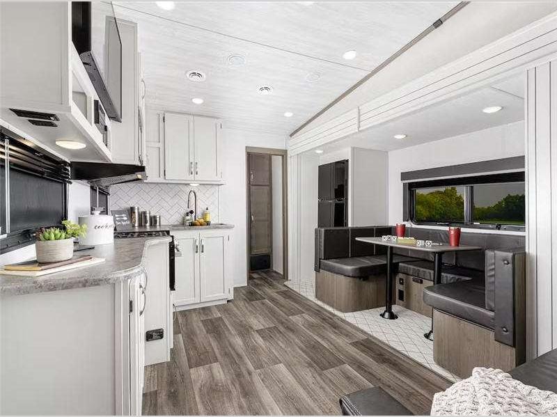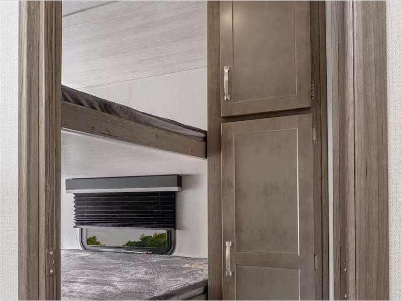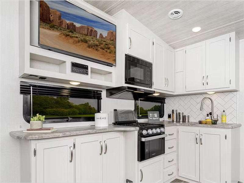 There is a Road Armor shock absorbing hitch pin for smooth towing and an engineered structural I-beam chassis with stamped steel cross-members and outriggers for added strength. You'll feel right at home with pleated privacy shades, residential, shaker style hardwood cabinet doors, and seamless pressed countertops.