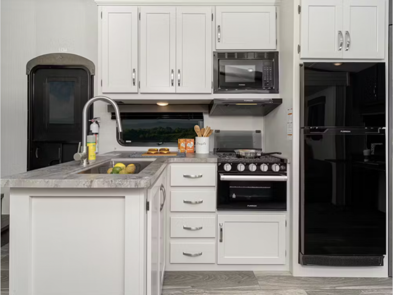 - 17" Furrion® range w/ Piezo ignition and glass stovetop cover