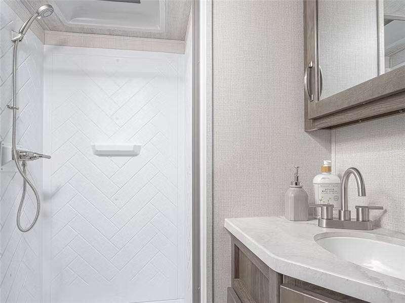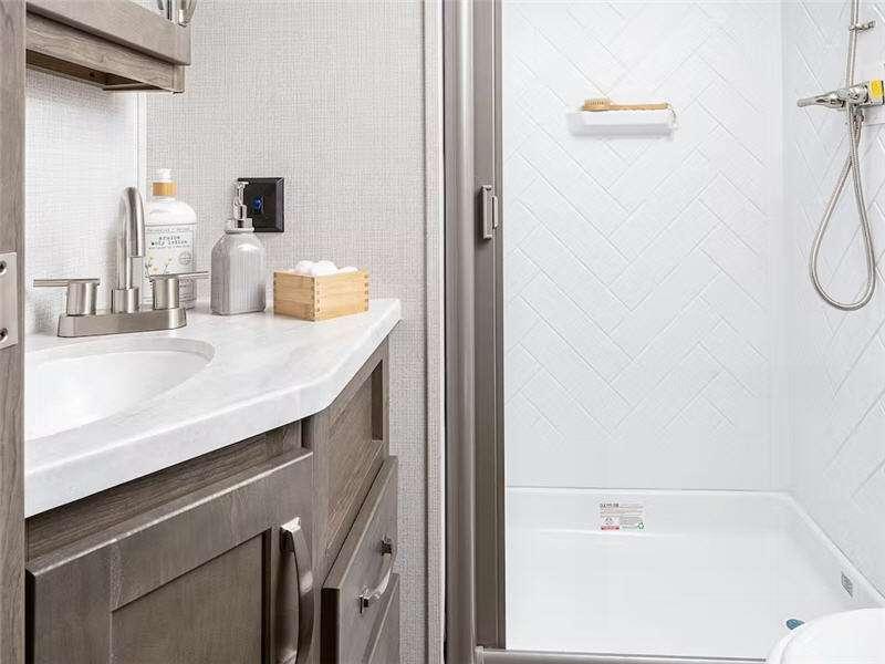- Large shower w/ retractable shower door and skylight