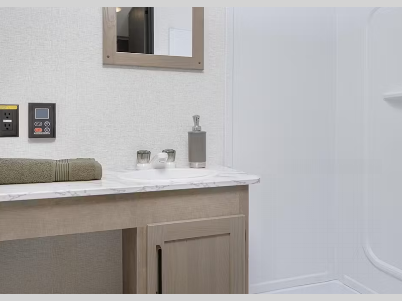 - Vanity storage base with sink and decorative mirror (select models)