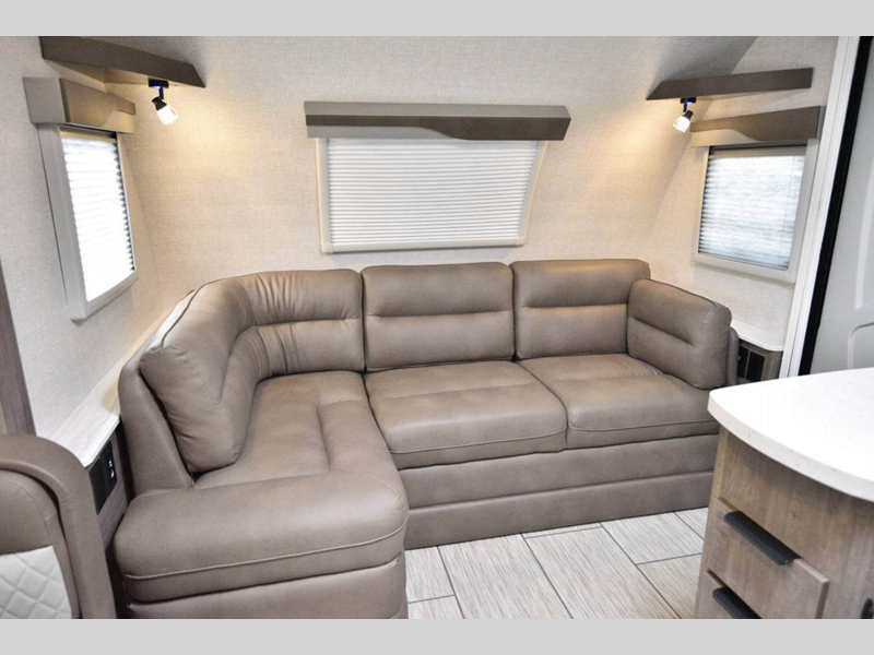 Each model is constructed with thermopane Euro windows, a molded fiberglass front cap, and Azdel interior panel walls for durability. There is Lite-Ply cabinet construction inside, along with Surf-X suedo solid surface lightweight countertops and tables, decorative backsplash, and many more interior comforts. Outside, the Keyed-Alike storage compartment doors will keep your gear secure and the exterior wash station will make it easy to wash off camp gear.