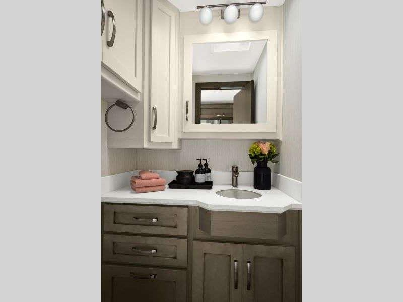 - Drop Down Bunk Bed Over Drvr/Pass Seats Extends to Windshield with Bunk Ladder, Fireplace with TV & Soundbar (Floor Plan 3811 Only)