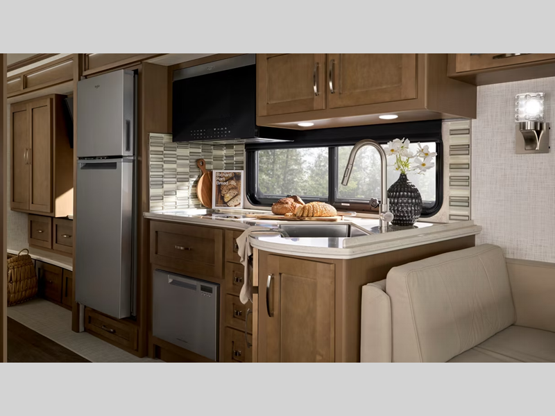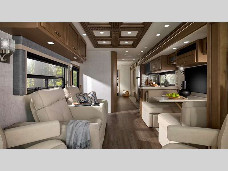 Sleeps 6 Slides 2 Length 39 ft 11 in Ext Width 8 ft 6 in Ext Height 12 ft 11 in Int Height 7 ft Interior Color Capilano, Excelsior, Sherbrooke Exterior Color Agawa, Ausable, Havasu Hitch Weight 6000 lbs GVWR 32000 lbs Dry Weight 25950 lbs Cargo Capacity 6050 lbs Fresh Water Capacity 75 gals Grey Water Capacity 60 gals Black Water Capacity 40 gals Tire Size 275/80R 22.5 Furnace BTU 35000 btu Generator 8 kW Cummins Onan® Quiet Series Fuel Type Diesel Engine Cummins 6.7 Chassis Freightliner Horsepower 340 hp Fuel Capacity 80 gals Wheelbase 274 in Available Beds Queen Torque 700 ft-lb Refrigerator Type Norcold Refrigerator Size 10 cu ft Convection Cooking Yes Cooktop Burners 3 Shower Size 40" x 30" Number of Awnings 1 Axle Weight Front 12000 lbs Axle Weight Rear 20000 lbs Garage Size 10 ft LP Tank Capacity 25 gal. Water Heater Type On Demand AC BTU 43500 btu TV Info Samsung LED TV; LR, BR, 32" Garage Awning Info Apex Dual Stage Armless with Strip Lighting Washer/Dryer Available Yes Gross Combined Weight 33000 lbs Shower Type Standard Electrical Service 50 amp Similar Floorplans