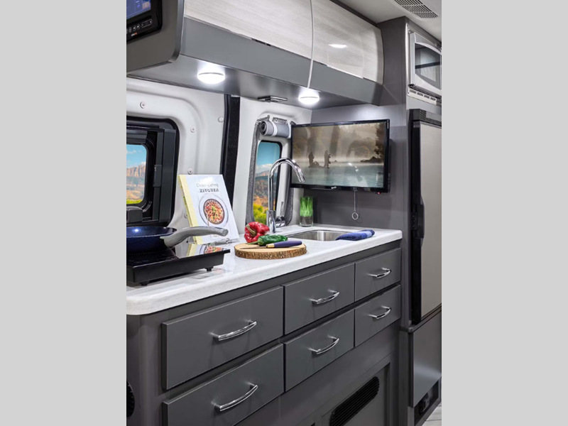Sleeps 2 Length 19 ft 8 in Ext Width 7 ft 8 in Ext Height 10 ft 6 in Int Height 6 ft 4 in Interior Color Coastal Cream, White Sand Exterior Color Full Body Paint; Tenorite Gray, Blue Gray, Silver Grey Hitch Weight 5000 lbs GVWR 9050 lbs Fresh Water Capacity 22 gals Grey Water Capacity 20 gals Black Water Capacity 4.75 gals Furnace BTU 13600 btu Fuel Type Diesel Engine 2.0L 4-Cylinder Chassis Mercedes-Benz Sprinter 2500 Horsepower 211 hp Fuel Capacity 24.5 gals Wheelbase 144 in Torque 332 ft-lb Refrigerator Type Single Door 12V Electric Cooktop Burners 1 Number of Awnings 1 Water Heater Capacity 2.64 gal Water Heater Type Diesel AC BTU 11000 btu TV Info LR 24" Smart TV Awning Info 10' 8" Power Thule Lateral Arm with Integrated LED Lighting Gross Combined Weight 13930 lbs Shower Type Wet/Bath Shower Electrical Service 30 amp -