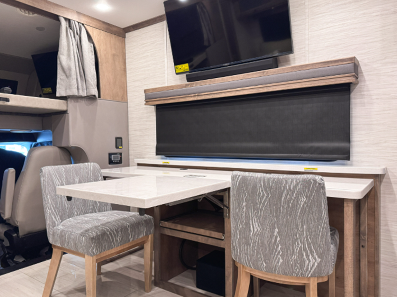 Sleeps 8 Slides 3 Length 39 ft 4 in Ext Width 8 ft 5 in Ext Height 13 ft 3 in Int Height 7 ft 2 in Interior Color Adobe Pendleton National Parks Collection, Morocco, Vapor Exterior Color Generation 3 Paint Schemes, Midnight Blue Hitch Weight 12000 lbs GVWR 33000 lbs Fresh Water Capacity 150 gals Grey Water Capacity 70 gals Black Water Capacity 45 gals Tire Size 275/80R 22.5 Furnace BTU 35000 btu Generator 8.0 kW Onan Quiet Diesel Fuel Type Diesel Engine Cummins B6.7 Chassis Freightliner S2RV Horsepower 360 hp Fuel Capacity 100 gals Wheelbase 279 in Number Of Bunks 1 Available Beds King Torque 800 ft-lb Refrigerator Type Stainless Steel Residential w/Top Freezer Refrigerator Size 20 cu ft Convection Cooking Yes Cooktop Burners 3 Shower Size 28.5" x 40.5" Number of Awnings 1 Axle Weight Front 12000 lbs Axle Weight Rear 21000 lbs LP Tank Capacity 20.3 gals Water Heater Type Truma AquaGo Comfort Instant AC BTU 30000 btu Basement Storage 136 cu. ft. TV Info LR Mounted Overhead TV, BR Mounted TV Awning Info Girard Patio w/LED Lighting Washer/Dryer Available Yes Gross Combined Weight 45000 lbs Shower Type Shower w/Seat Electrical Service 50 amp Similar Floorplans