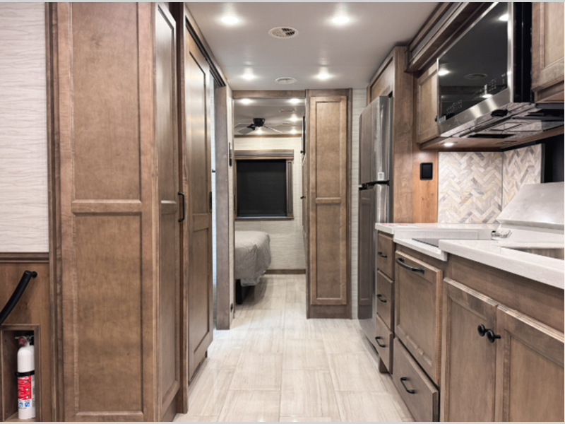 Sleeps 6 Slides 2 Length 35 ft 7 in Ext Width 8 ft 5 in Ext Height 13 ft 3 in Int Height 8 ft Interior Color Adobe Pendleton National Parks Collection, Morocco, Vapor Exterior Color Generation 3 Paint Schemes, Midnight Blue Hitch Weight 12000 lbs GVWR 33000 lbs Fresh Water Capacity 150 gals Grey Water Capacity 70 gals Black Water Capacity 45 gals Tire Size 275/80R 22.5 Furnace BTU 35000 btu Generator 8.0 kW Onan Quiet Diesel Fuel Type Diesel Engine Cummins B6.7 Chassis Freightliner S2RV Horsepower 360 hp Fuel Capacity 100 gals Wheelbase 238 in Number Of Bunks 1 Available Beds King Torque 800 ft-lb Refrigerator Type Stainless Steel Residential w/Top Freezer Refrigerator Size 20 cu ft Convection Cooking Yes Cooktop Burners 3 Shower Size 28" x 40" Number of Awnings 1 Axle Weight Front 12000 lbs Axle Weight Rear 21000 lbs LP Tank Capacity 20.3 gals Water Heater Type Truma AquaGo Comfort Instant AC BTU 30000 btu Basement Storage 93 cu. ft. TV Info LR Mounted TV, BR Mounted TV Awning Info Girard Patio w/LED Lighting Washer/Dryer Available Yes Gross Combined Weight 45000 lbs Shower Type Shower w/Seat Electrical Service 50 amp Similar Floorplans