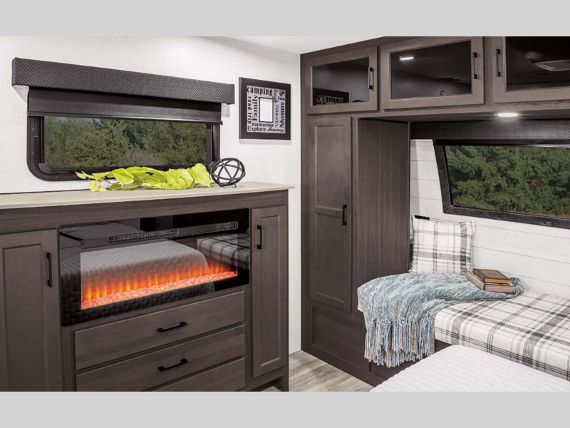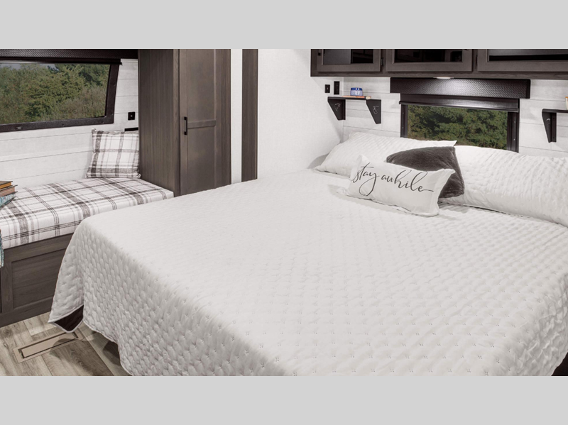 A PVC roof membrane covers protects the top of these units and a heated and enclosed underbelly protects the bottom. The RV airflow A/C system increases the 15,000 BTU air flow by an average of 40% for an improved performance, faster cooling time, and reduction of noise. You will also appreciate the 200W solar panel for off-grid capabilities, and the leveling system will have you set up at camp in no-time!